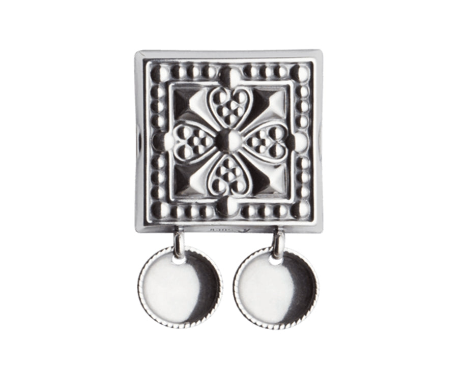 Beltestøl i oksidert sølv. Motivet med diagonalkorset finner man igjen i mye av bunadsølvet rundt om i landet, og denne typen beltestøler har gjennom generasjoner vært den mest brukte. Størrelse: 30x30mm.