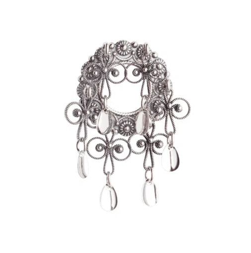 En søt, liten barnesølje i oksidert sølv med filigranheng og dråpeformet løv. Fin gave til en bunadsjente! Størrelse: 26x45 mm.