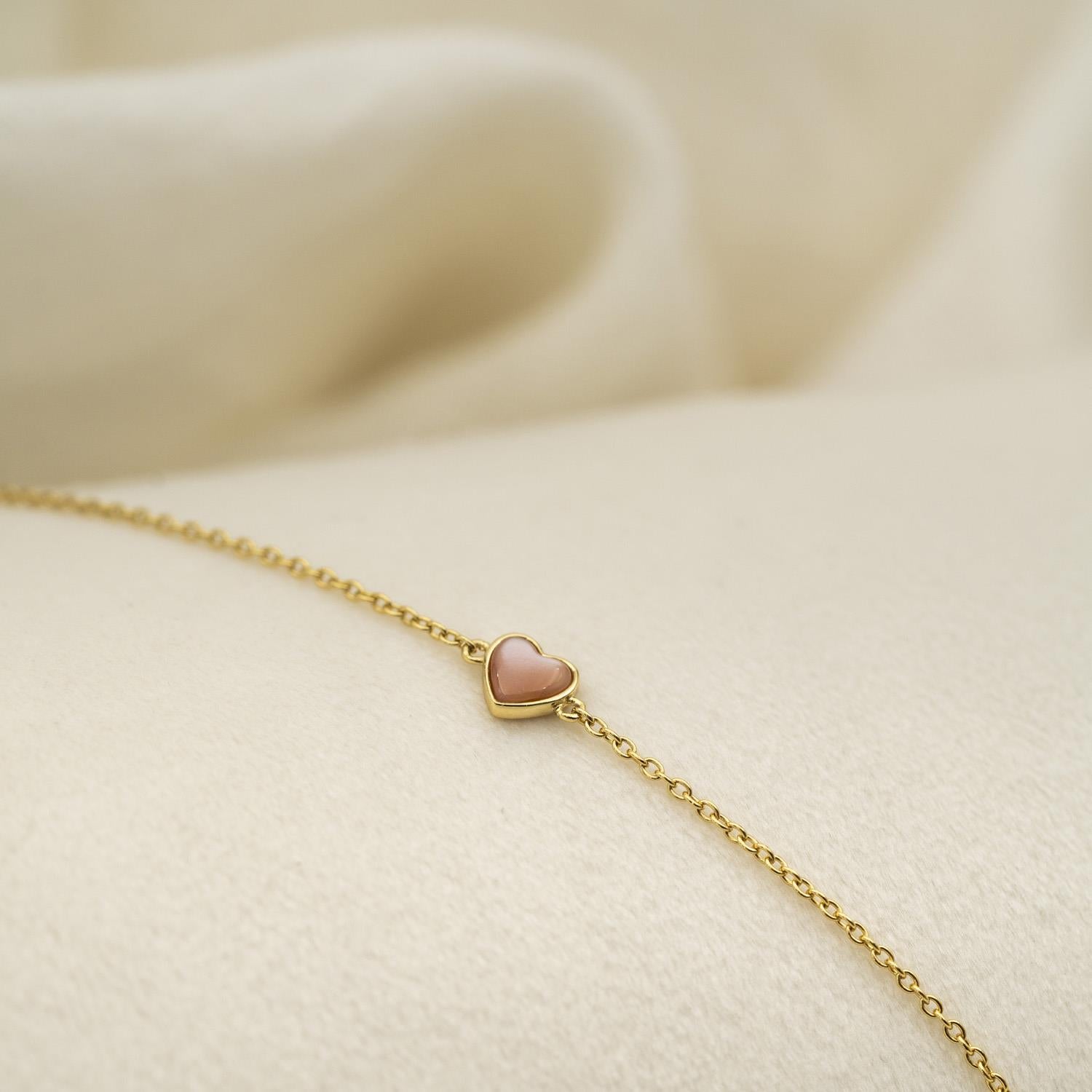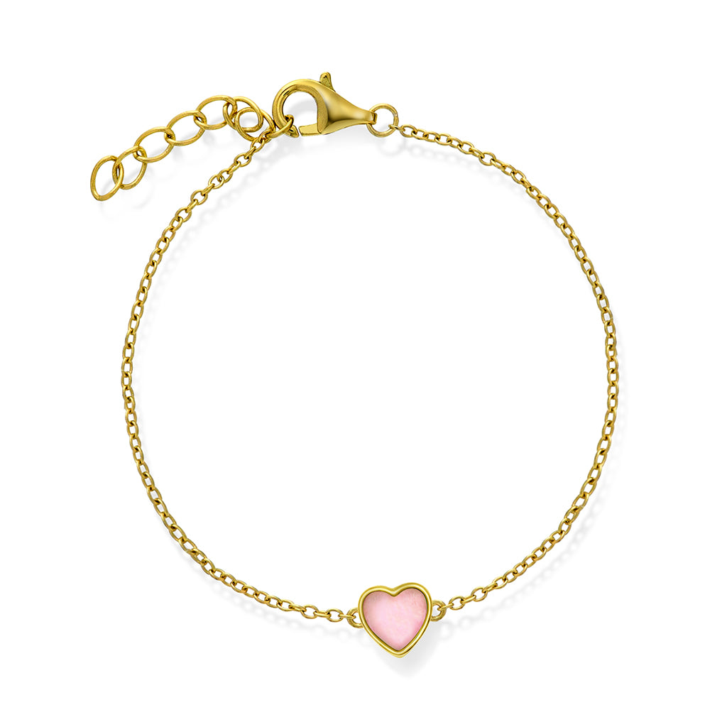 Armbånd i forgylt sølv med rosa perle, formet som et hjerte.