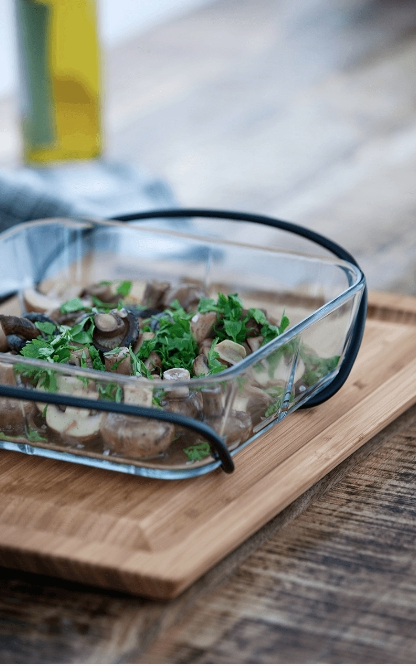 Det lille ovnfaste fatet i glass har et enkelt og lett uttrykk og kan gå direkte fra ovn til et dekket bord. Bruk det også til servering av snacks, frisk frukt og små salater.