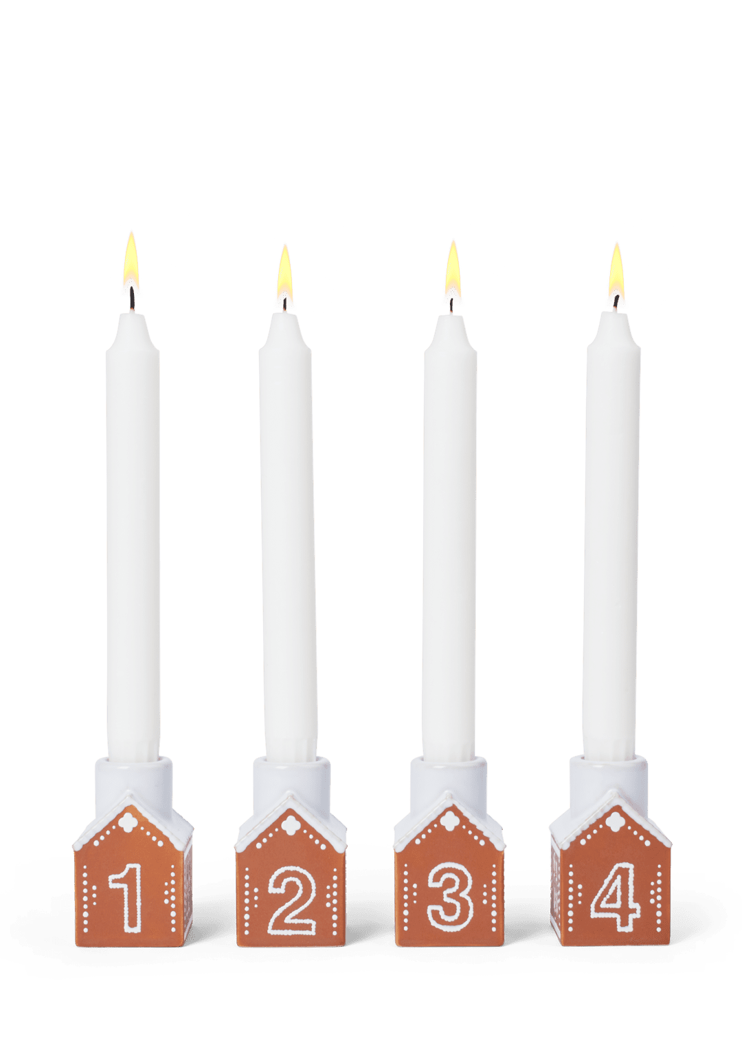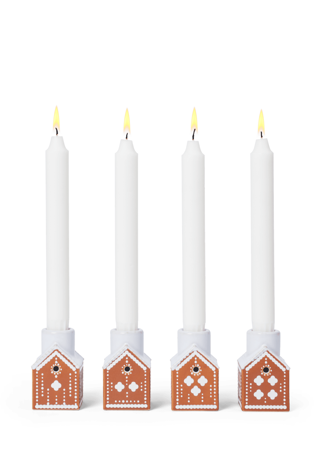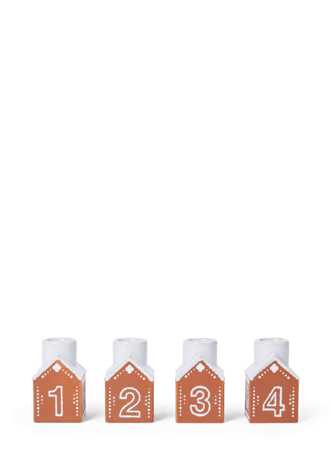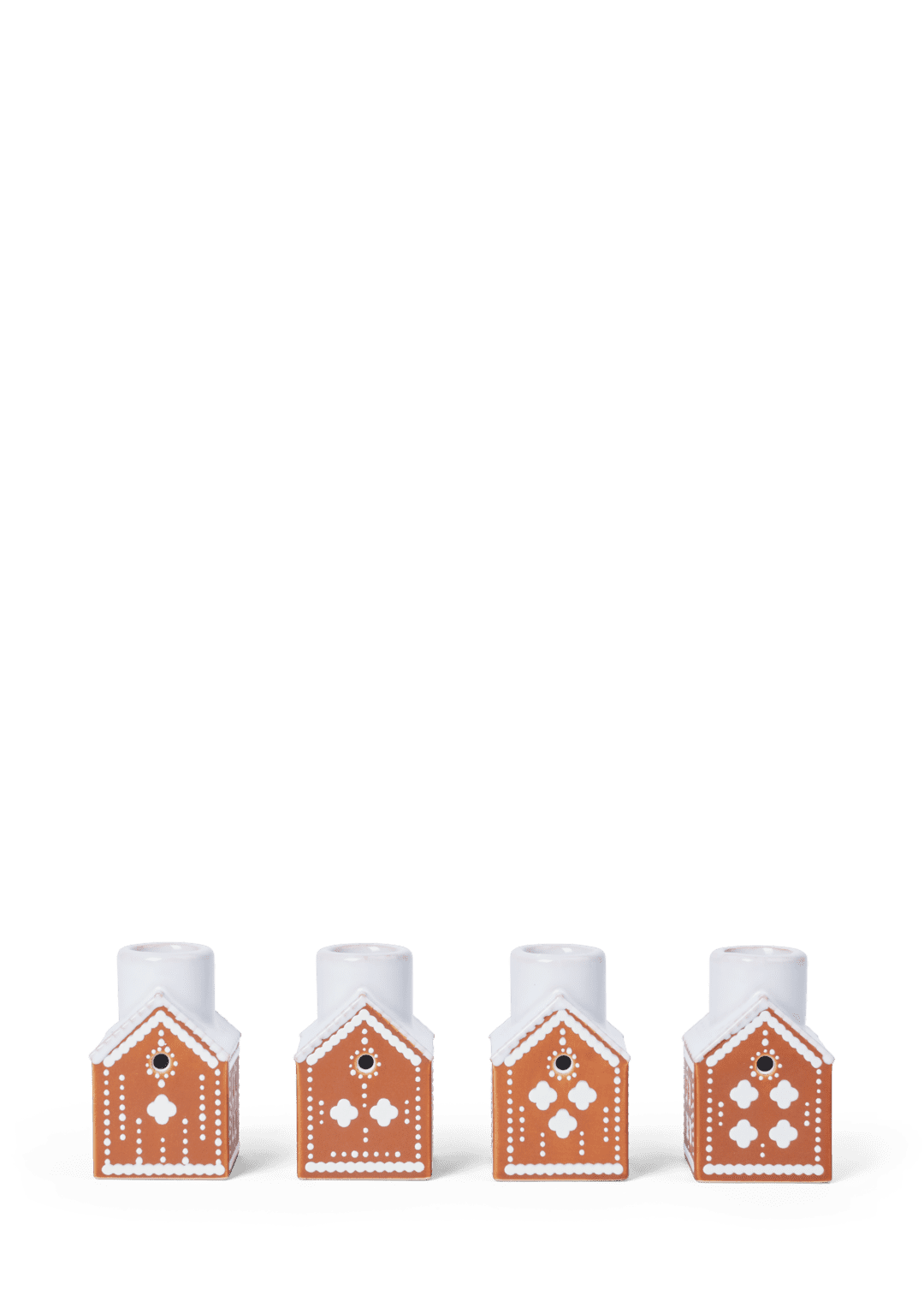 Kähler Gingerbread adventsstake måler 7,5 cm i høyden og består av fire små minilyshus til kronelys, som med intrikate mønstre og snø på taket perfekt komplementerer de større Gingerbread-lyshusene. Hvert hus er utsmykket som en tradisjonell adventsstake med håndtegnede tall fra 1 til 4. Og hvis du foretrekker nummerering uttrykt som et dekorativt mønster, har du muligheten til å snu dem rundt og la hver søndag i advent bli illustrert med de fineste snøfnuggene – akkurat som man ville dekorert et pepperkakehus.