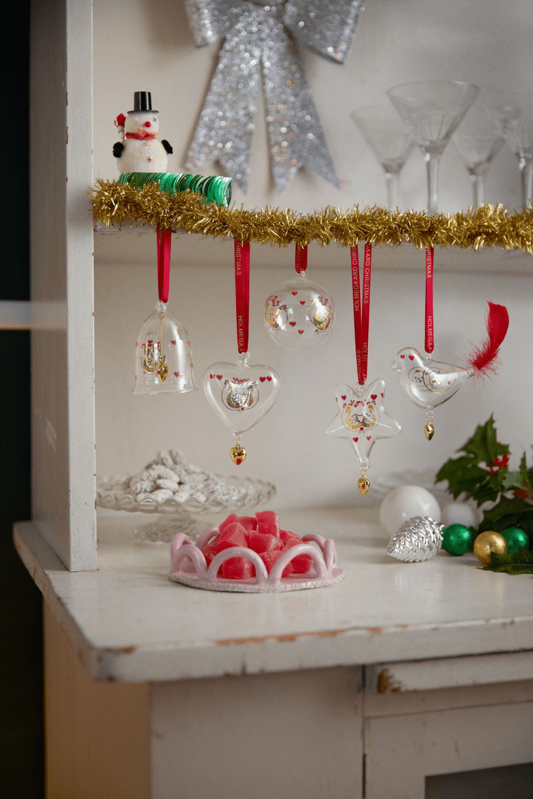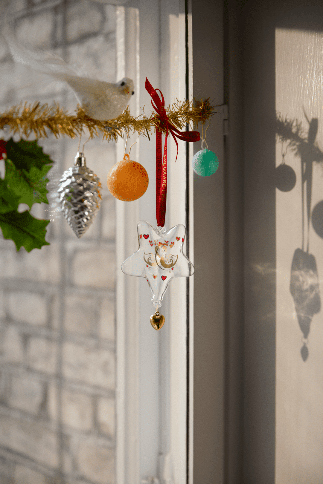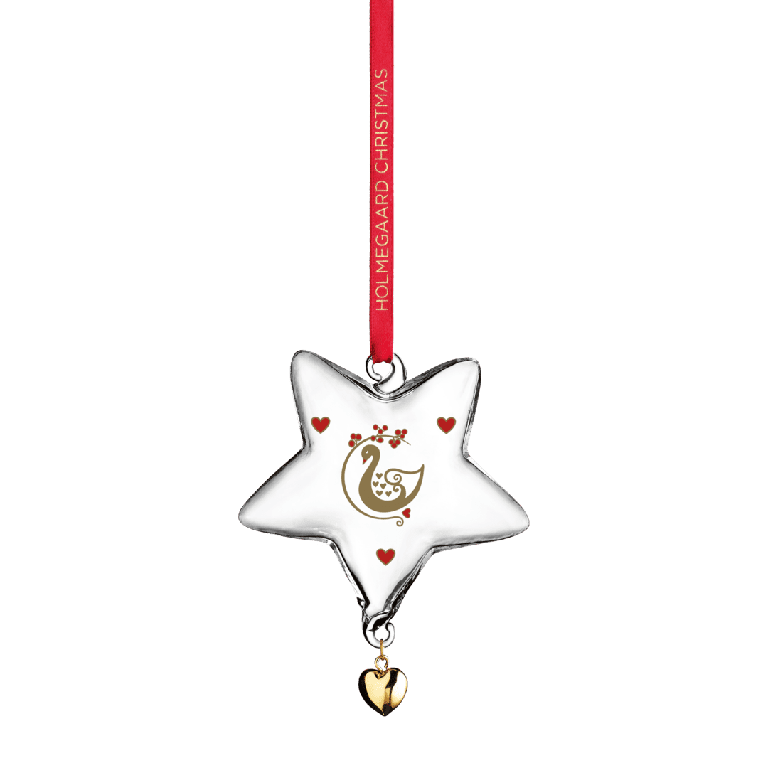 Holmegaard ble grunnlagt i 1825, og med årets 2025-glasspynt feirer merket sitt 200-årsjubileum med et design inspirert av svanen. Denne stolte og elegante fuglen er et symbol for Holmegaard, og sammen med små hjerter og en gren med røde vinterbær formidler årets motiv på en vakker og dekorativ måte transformasjon, skjønnhet og en poetisk glede.