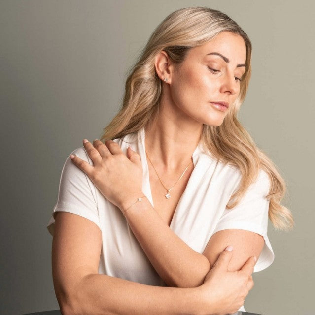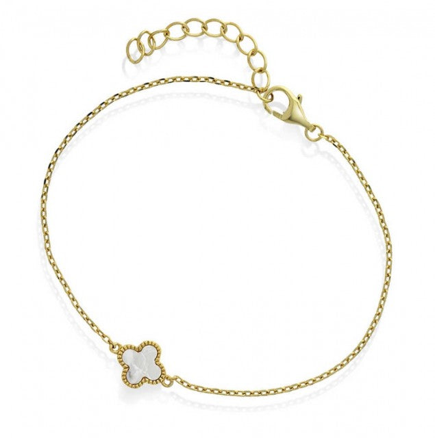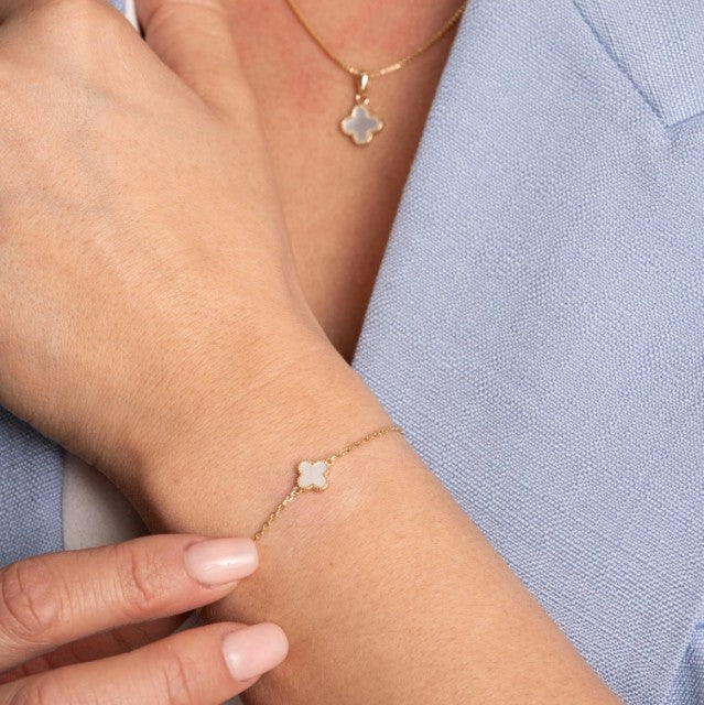 Trendy armbånd i forgylt sølv med klassisk kløver og hvit perlemor fra Pan Jewelry Trend. Finnes også tilhørende smykke, ring og øredobber, samt i flere farger. H: 8 mm, B: 8 mm.