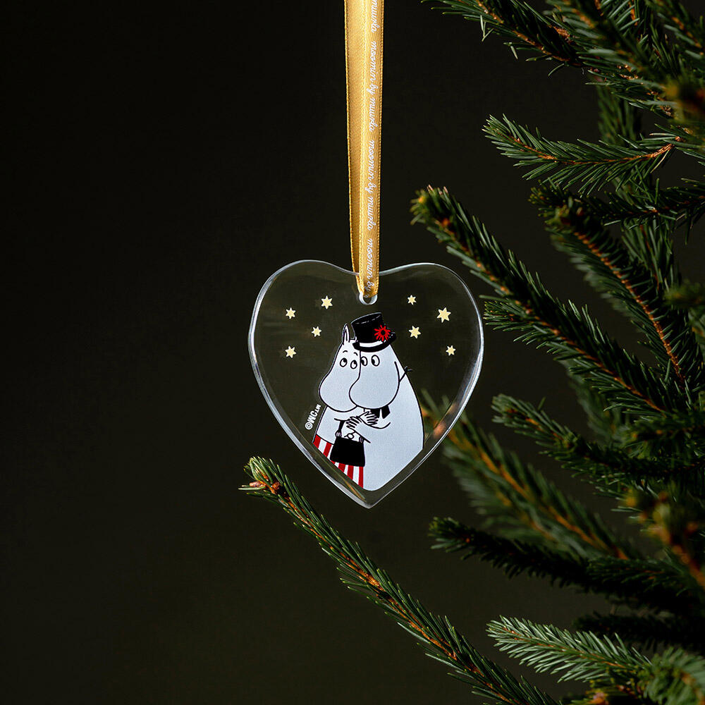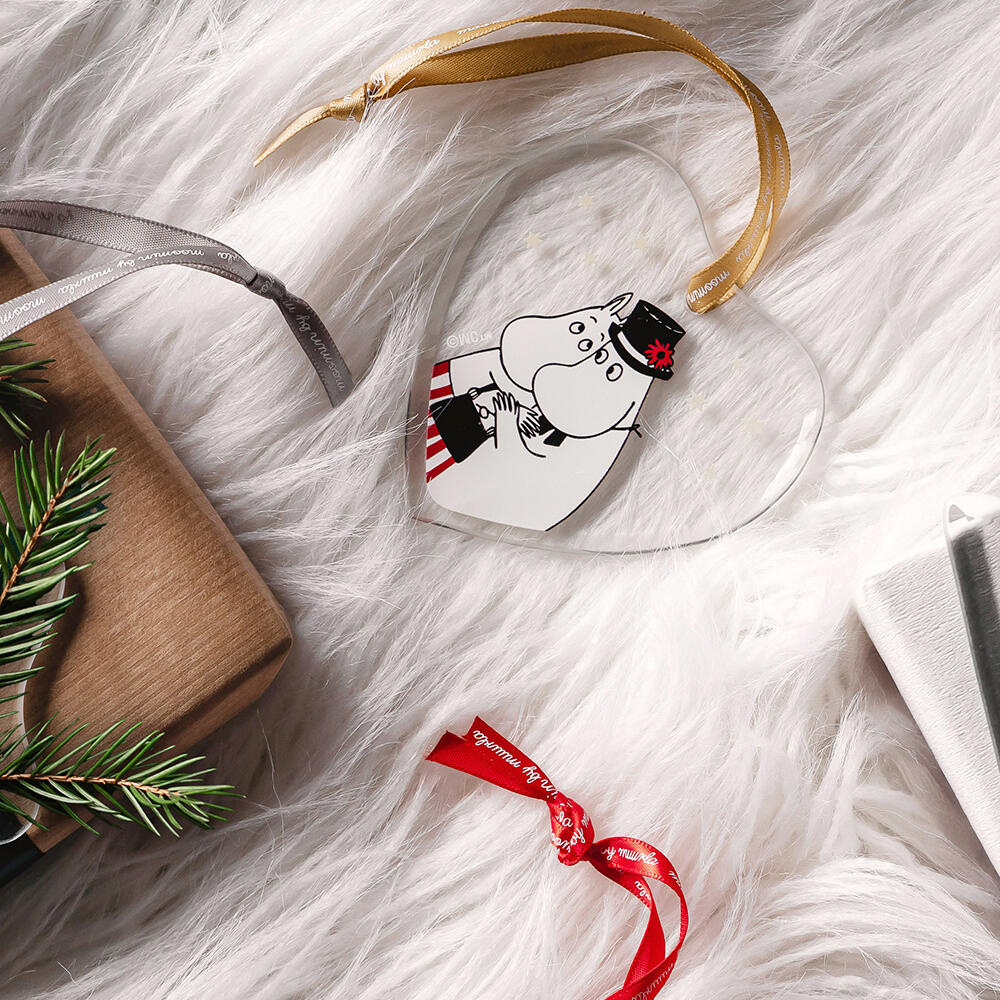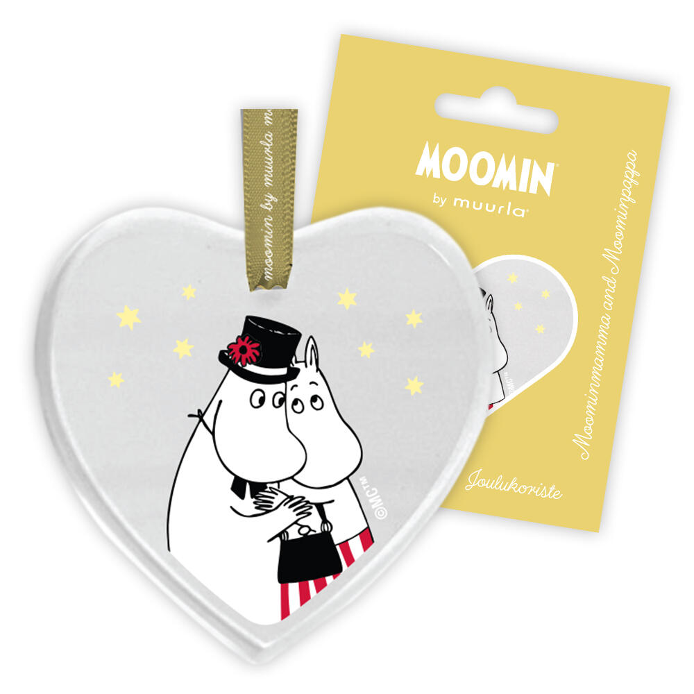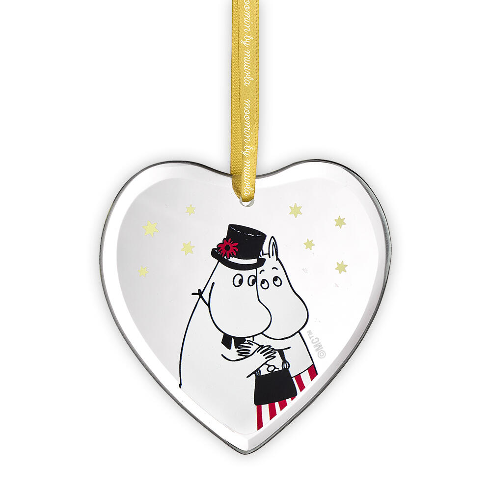 Mummi glassdekor med motiv av Mummimamma og Mummipappa. Dekorasjonen er stilren og passer utmerket på årets juletre eller et annet sted i hjemmet.