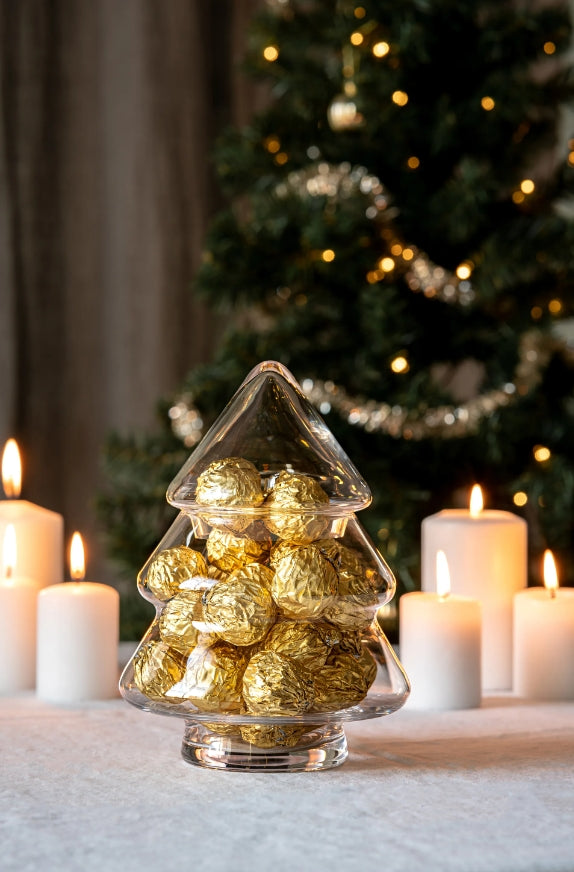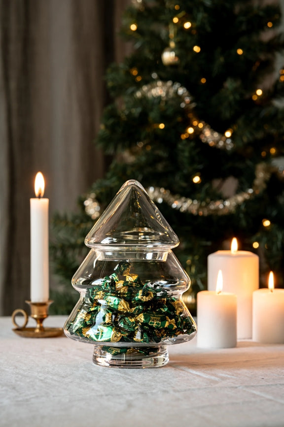 Glasskrukke med lokk laget som et juletre med lokk. Like fin alene som til julekaker, lysslynge eller annen dekor.