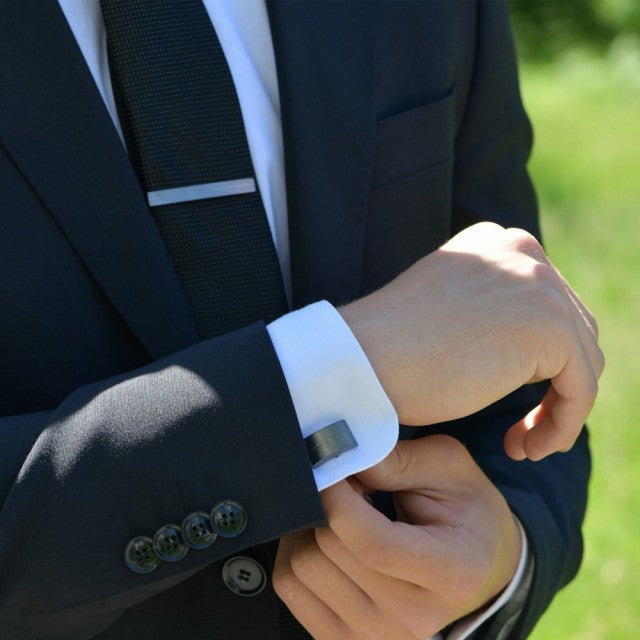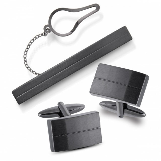 Manskjettknapper og slipsnål i sotet stål. Slipsnålen har sikkerhetslenke. Sett-eske medfølger.