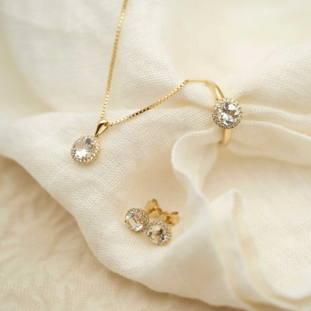 Øredobber i gult gull med diamanter 0,17 ct WSI og hvit topaz. Finnes i sett med smykke, øredobber og ring. H:7,5 mm B:7,5m.