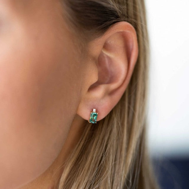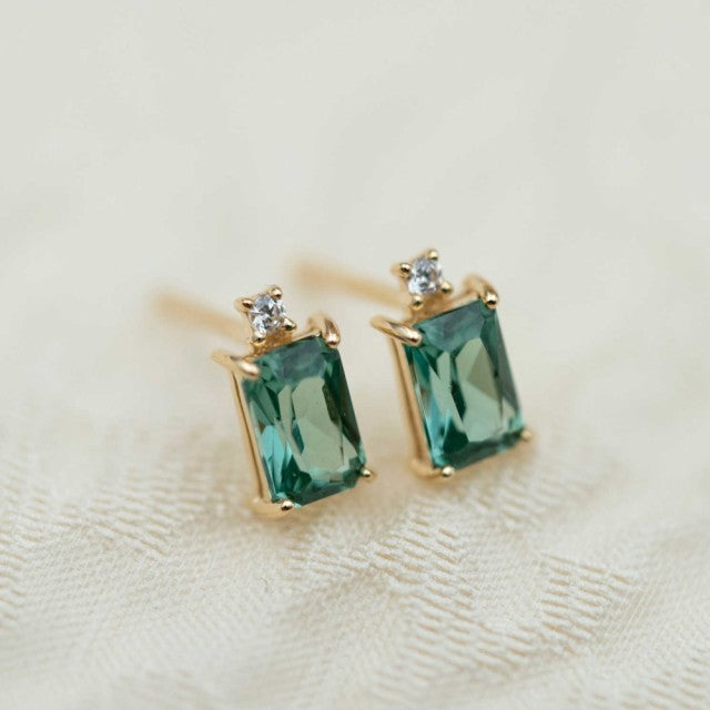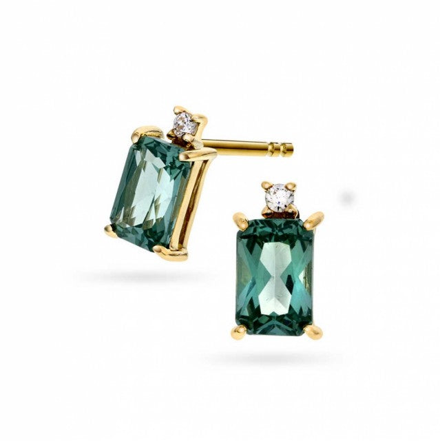 Øredobber i gult gull med grønn spinell. Finnes i sett med smykke, øredobber og ring. H:8,5 mm B:5 mm.