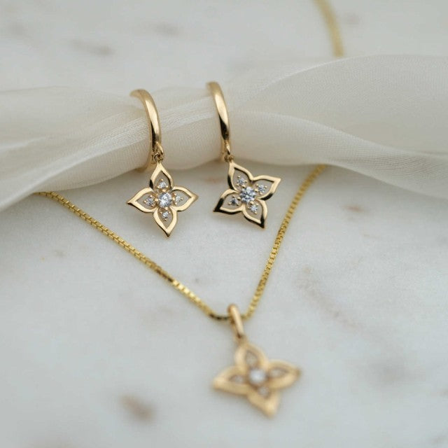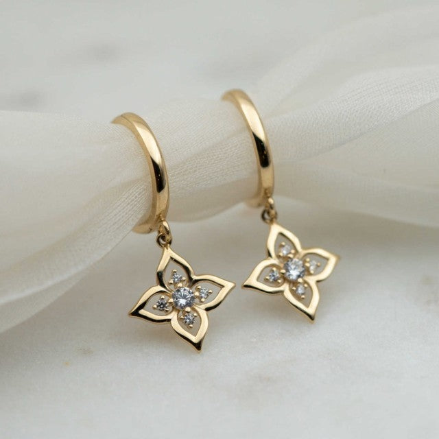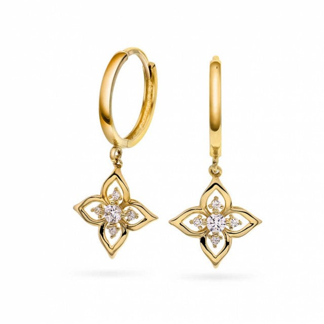 Øreringer i gult gull med zirkonia. H: 27mm, B: 12mm.