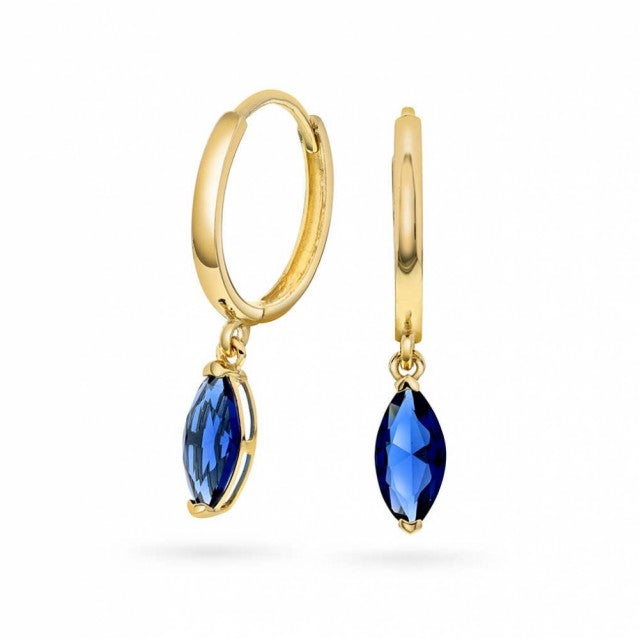 Øreringer i gult gull med blå zirkonia fra Pan Jewelry. H: 24mm, B: 4mm.