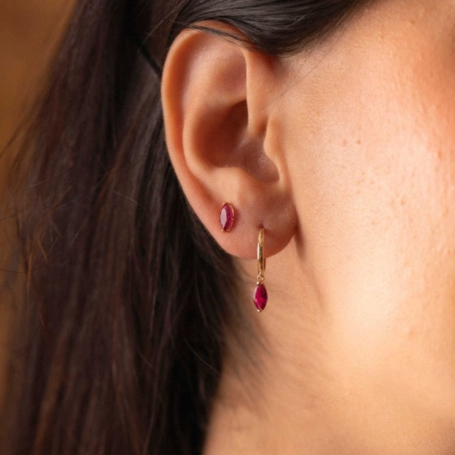 Øreringer i 585 gult gull med rød zirkonia. H: 24mm, B: 4mm.