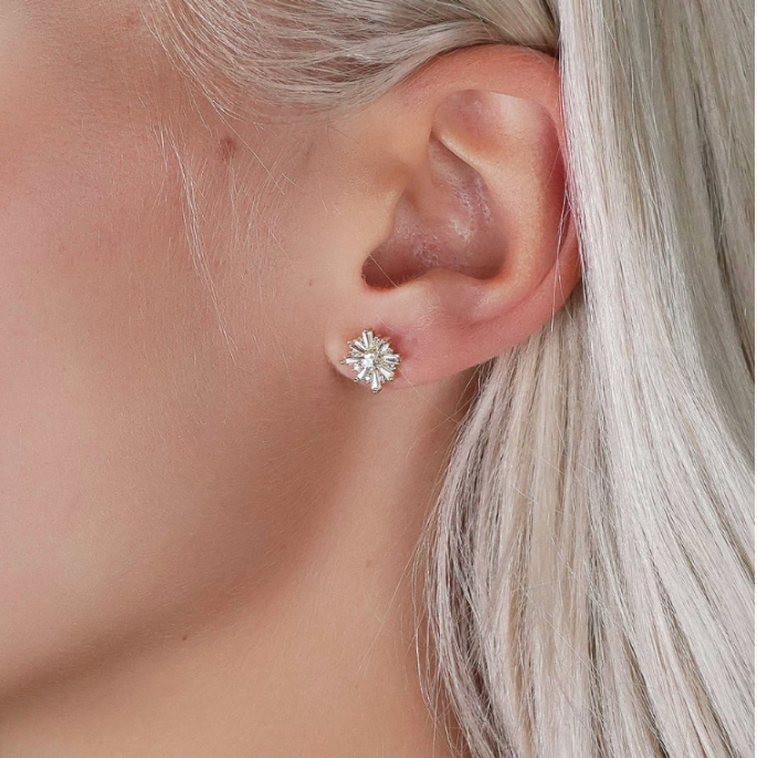 Søt liten pinneøredobb med zirkonia i forsølvet messing. Et fint tillegg til ethvert antrekk. Størrelse: 10 mm. Nikkelfri.