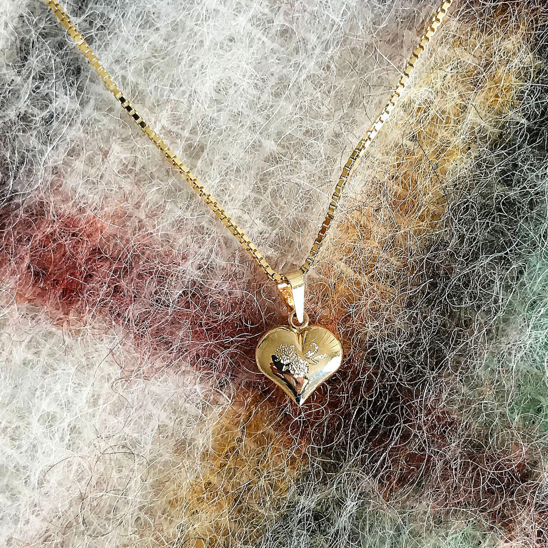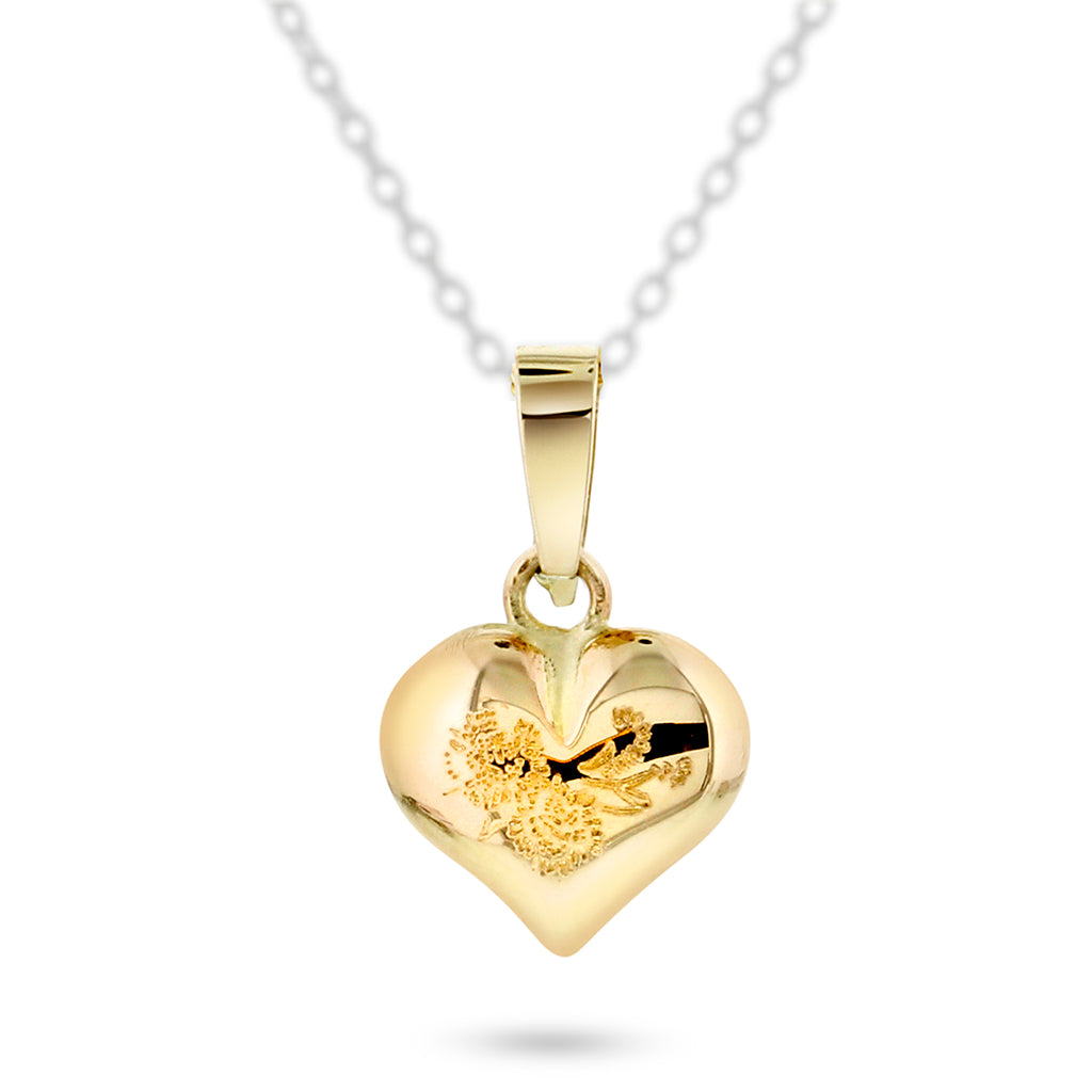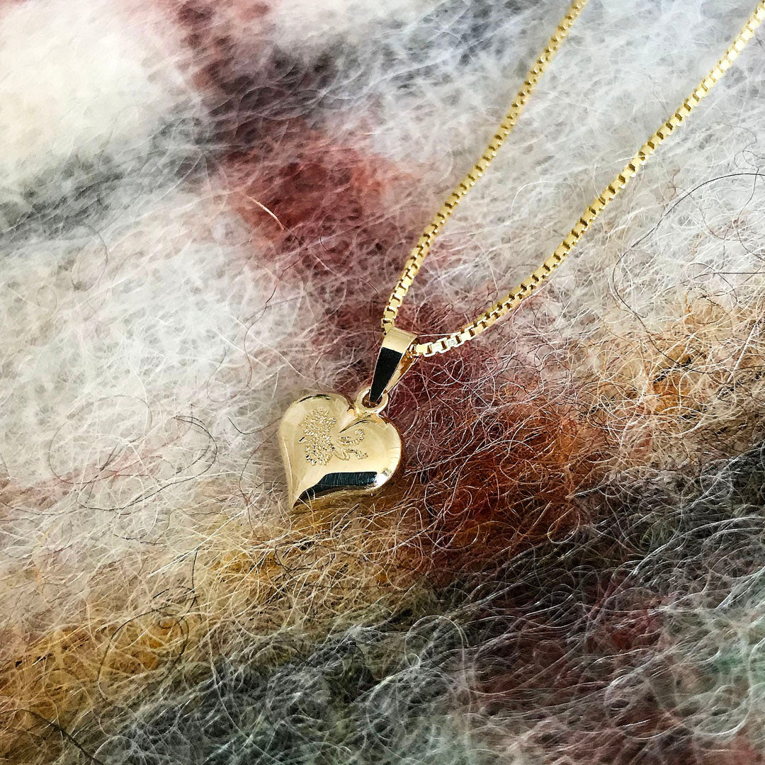 Hjerte-anheng med gravert dekor i 14k gull. Veneziansk kjede i forgylt sølv på 45 cm medfølger, samt gaveeske.