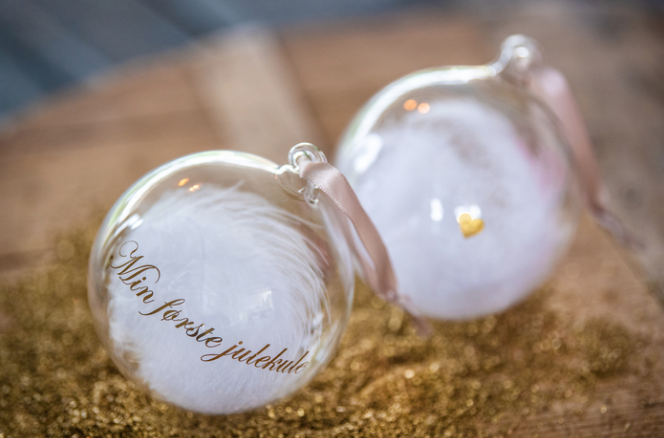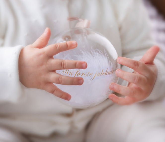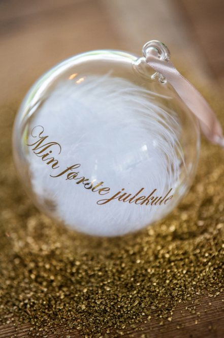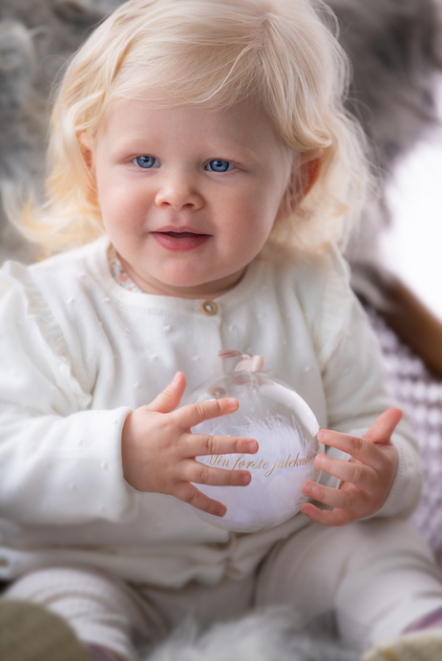 Den eksklusive julekulen MIN FØRSTE JULEKULE er munnblåst, håndlaget og fylt med vakre englefjær. Den er dekorert med gulltekst og et skinnende gullhjerte. Kulen er 10 cm i diameter, og den leveres med silkebånd klar til oppheng. MIN FØRSTE JUKEKULE vil år etter år bli hentet fram som et vakkert minne om barndommens jul.