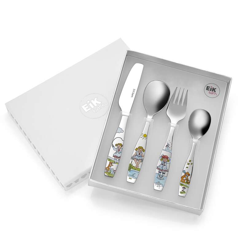 Barnebestikk i stål i fire deler. Består av kniv, skje, gaffel og babyskje. Tåler oppvaskmaskin.