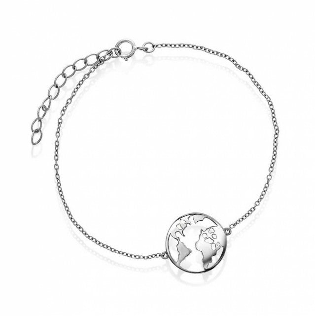 Armbånd i rhodinert sølv med verdenskart. L: 16+3cm, H: 15mm, B: 15mm.