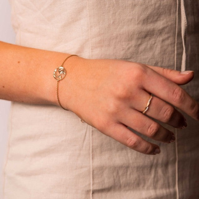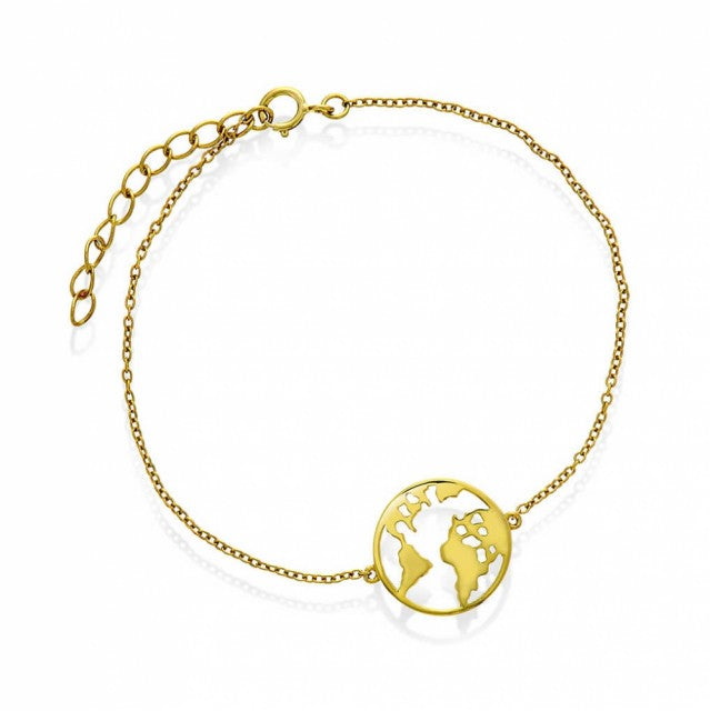 Armbånd i forgylt sølv med verdenskart. L: 16+3cm, H: 15mm, B: 15mm.