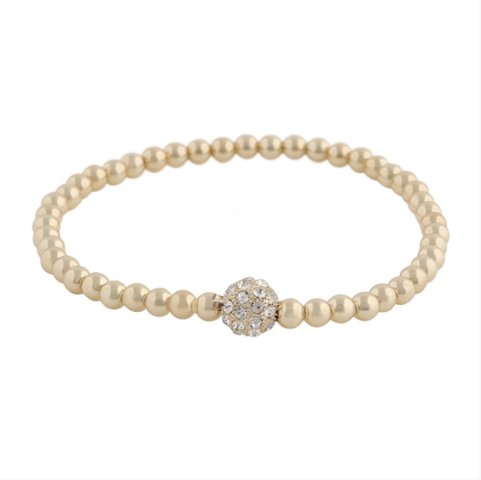 Mysk elastisk armbånd i forgylt messing med blanke steiner. Størrelse: 58–60 mm indre diameter. Nikkelfri.