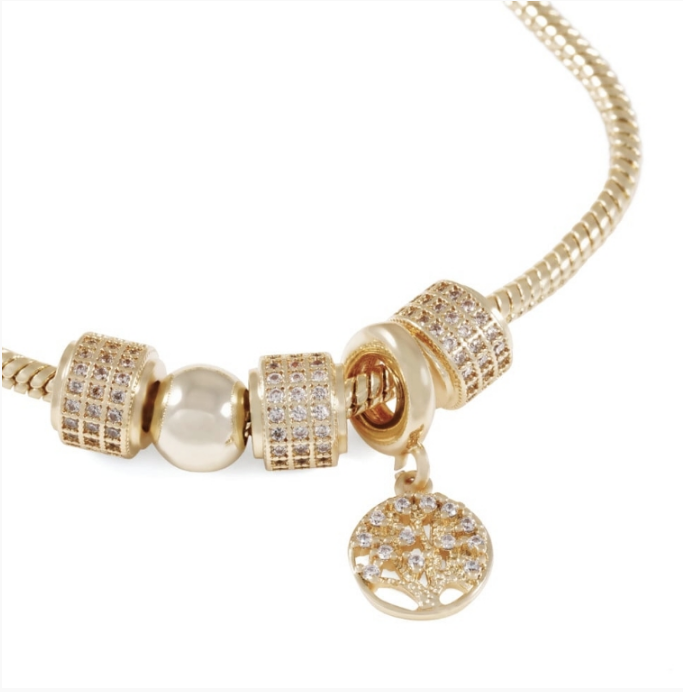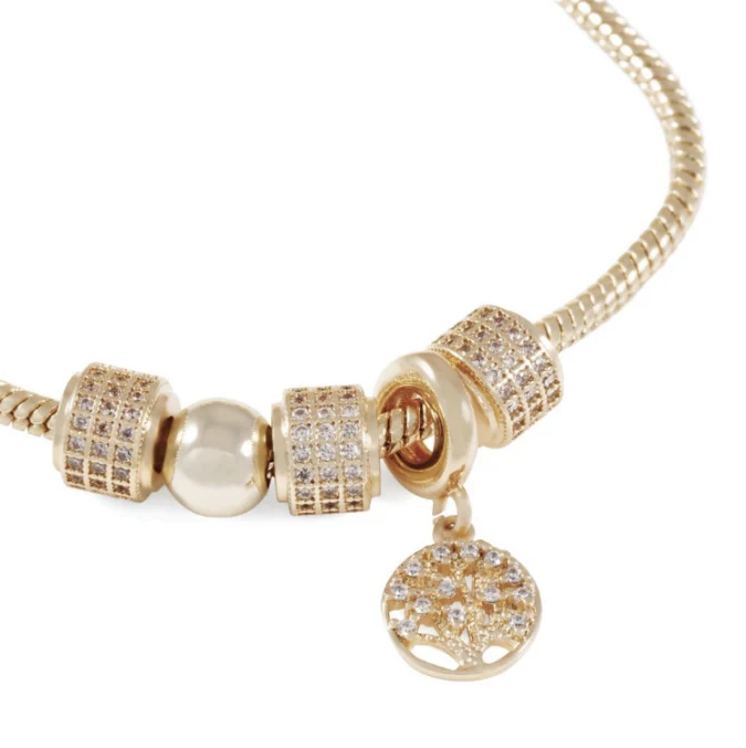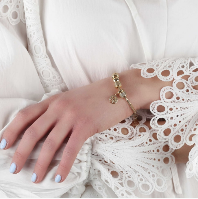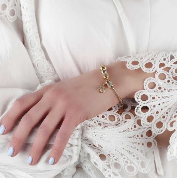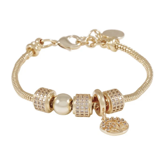 Armbånd med dekorative anheng, glitrende detaljer og en perle. Et elegant tilbehør som blander klassisk og moderne stil, laget i forgylt messing. Lengde: 16-18 cm. Nikkelfri.