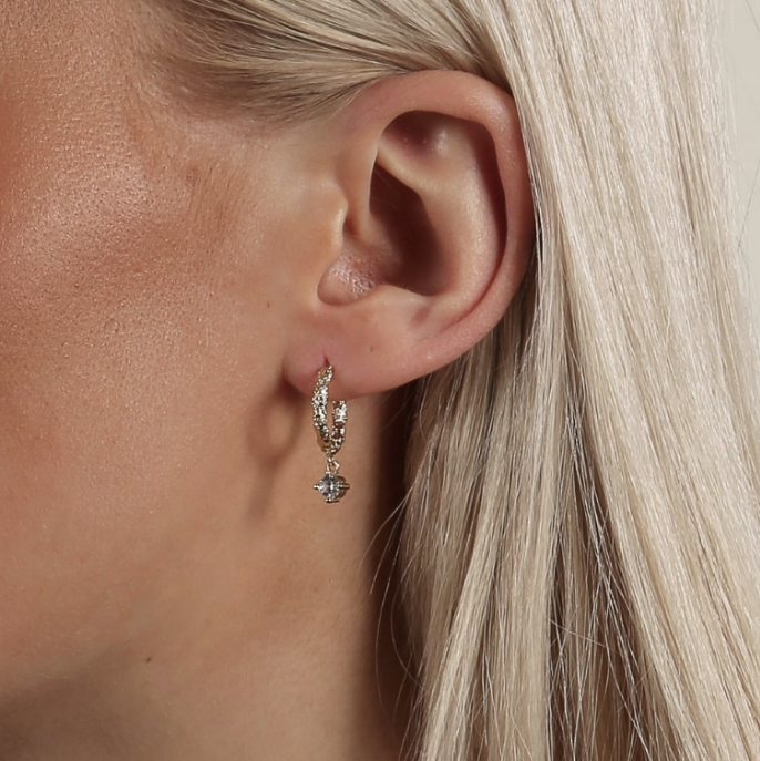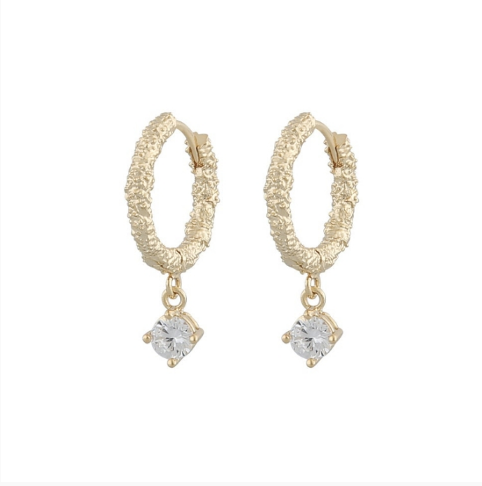 Nydelige øreringer i forgylt messing med en unik ujevn overflate og et hengende anheng med zirkonia. Disse øredobbene vil gi antrekket ditt et elegant preg. Størrelse: 15 mm. Zirkonia: 4 mm. Nikkelfri.