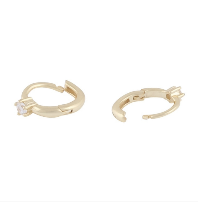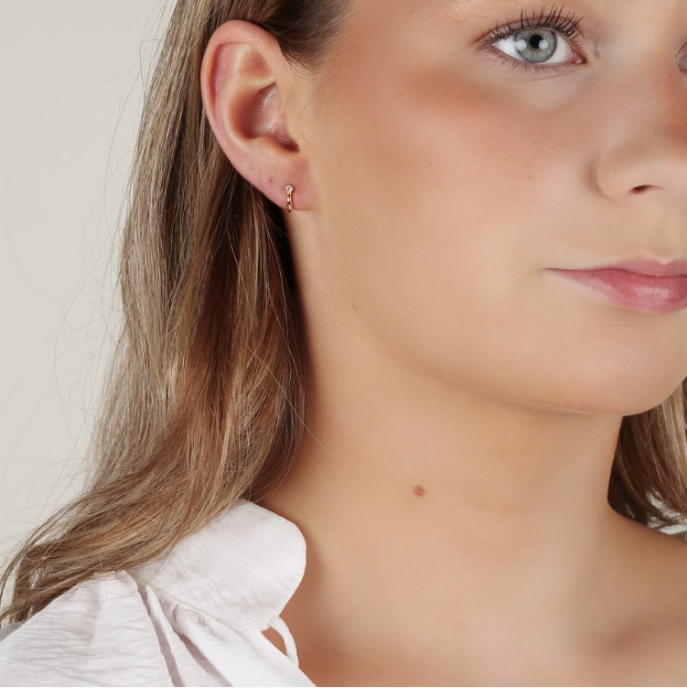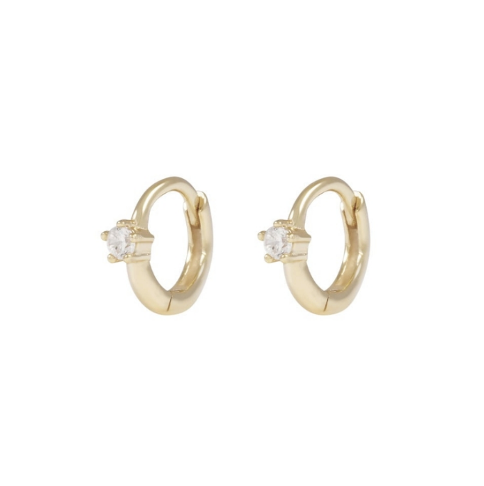 Siri Mini øreringer i forgylt messing med zirkonia. Små øreringer med innfatning. Et subtilt, men sofistikert tilbehør. Diameter: 8 mm. Sten: 2 mm. Nikkelfri.