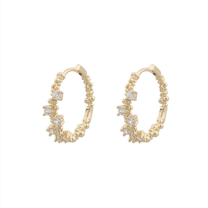 Søte øreringer i forgylt messing med unikt design og zirkoniasteiner. Disse trendy øredobbene passer til alle anledninger. Enkle å bruke med klikk-lås. Størrelse: 18 mm. Nikkelfri.