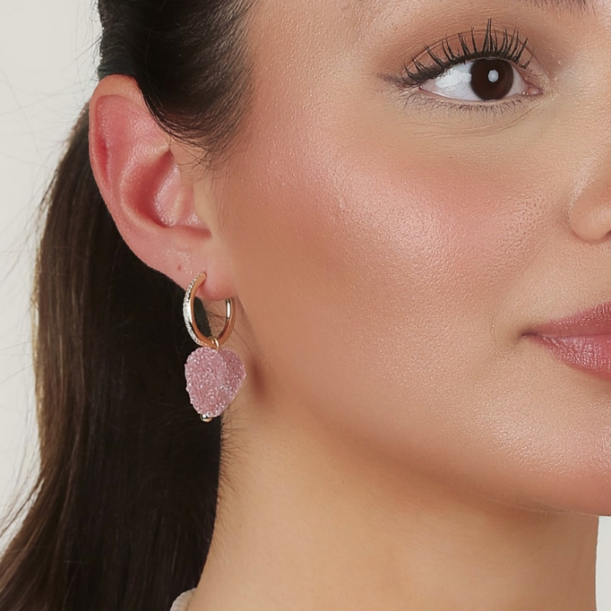 Morsomme og fargerike øredobber i 14 karat gullbelagt messing med zirkonia og et hjerteanheng i gummiharpiks (med sukkeraktig tekstur). Ørering: Diameter 20 mm. Hjerte-anheng: Høyde 19 mm. Bredde 20 mm. Nikkelfri.