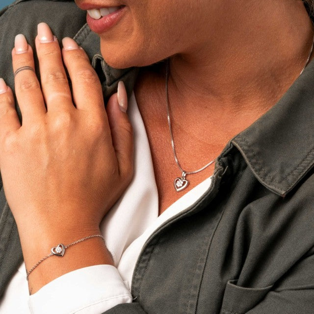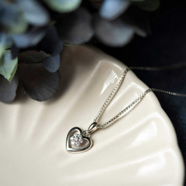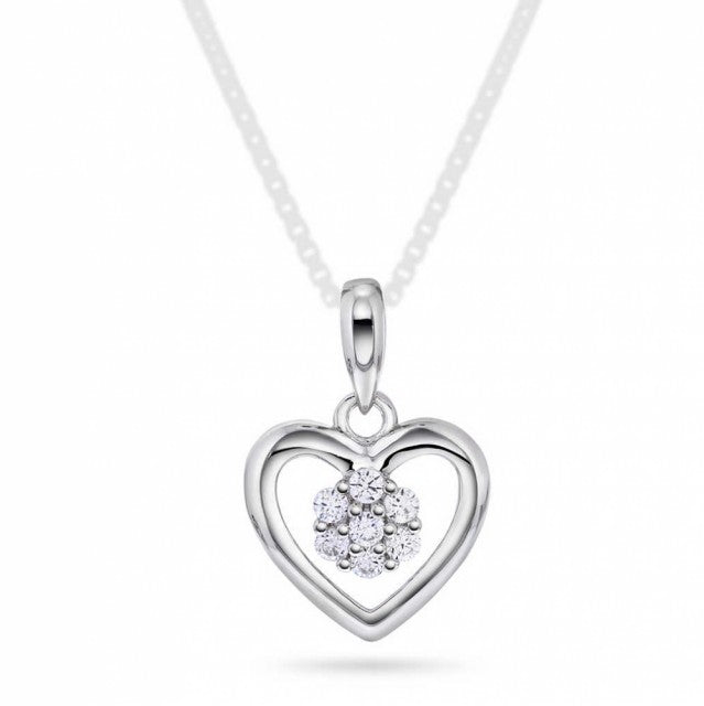 Smykke i rhodinert sølv med zirkonia formet som et hjerte.