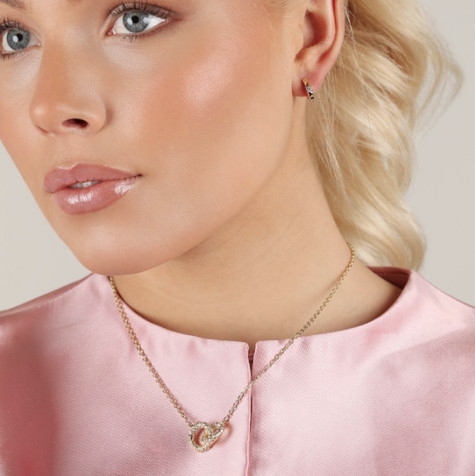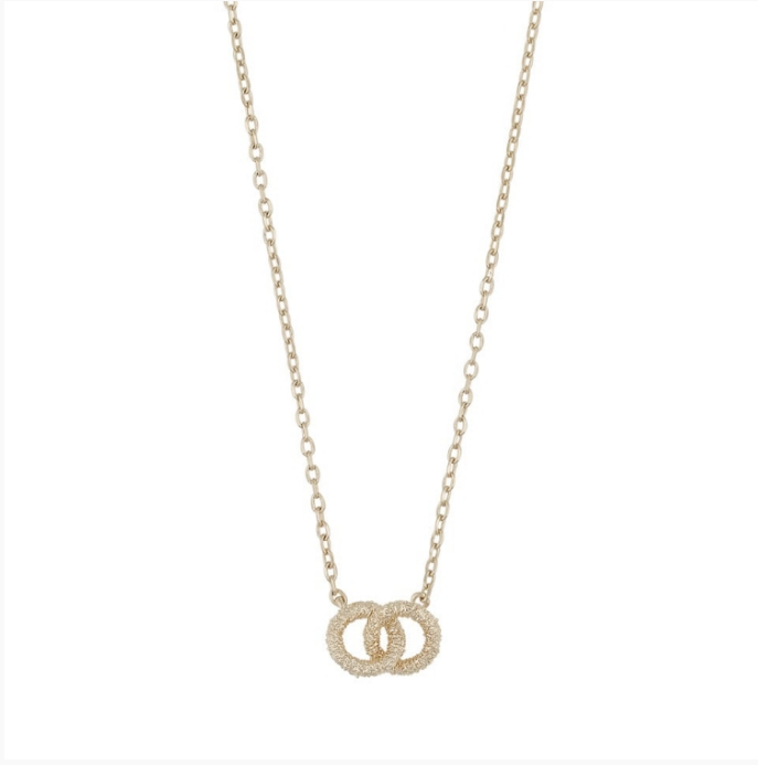 Gisele halskjede i forgylt messing. Lengde: 42 - 45 cm. Tilkoblede ringer: 15 mm.