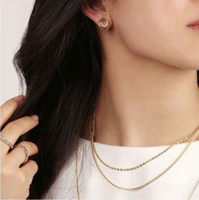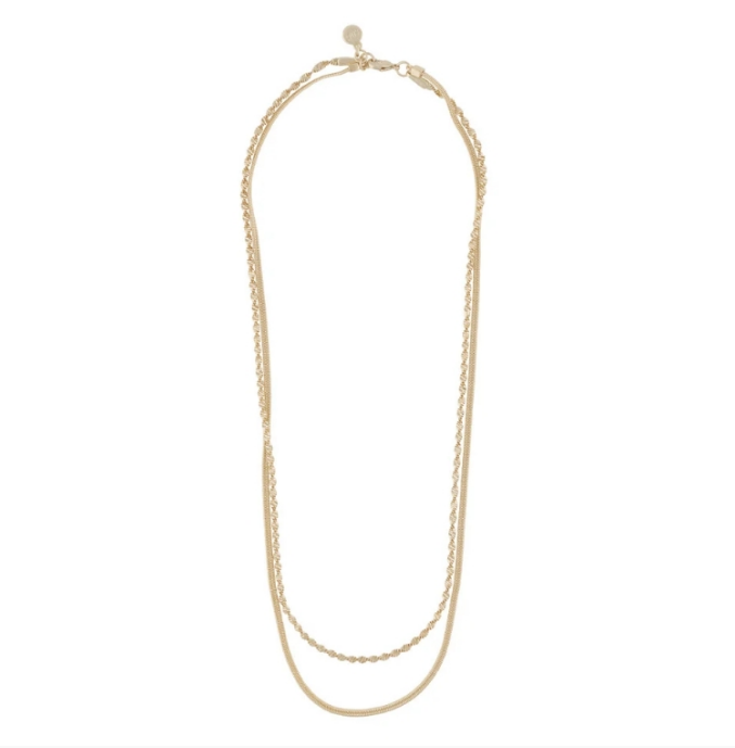 Serena dobbelt halskjede er laget av gullbelagt messing, med to kjeder i forskjellige design: en vridd og den andre en slangekjede. Hver kjede er 2,2 mm bred, og kjedet måler 45 og 42 cm i lengde. Nikkelfri.