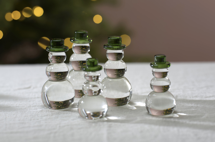 La disse julefigurene pryde bordet, enten samlet i en gruppe eller plassert hver for seg blant dine andre juledekorasjoner, for å skape et personlig uttrykk. Snømannen finnes i to størrelser, begge med grønn hatt, mens grantreet kommer i både klart og grønt glass.