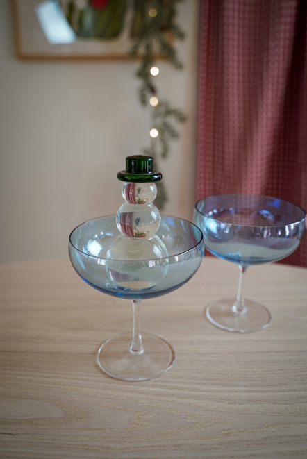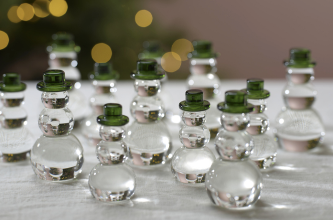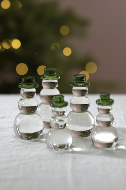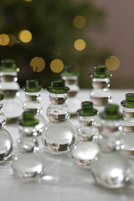 La disse julefigurene pryde bordet, enten samlet i en gruppe eller plassert hver for seg blant dine andre juledekorasjoner, for å skape et personlig uttrykk. Snømannen finnes i to størrelser, begge med grønn hatt, mens grantreet kommer i både klart og grønt glass.