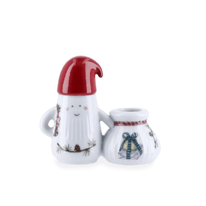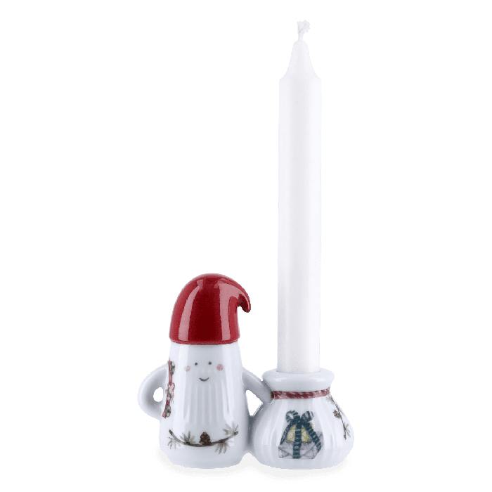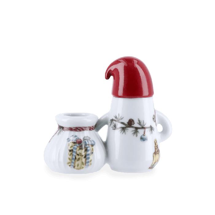 Hammershøi Christmas-nissefar lysestake med gavesekk er utformet med myke linjer og har de ikoniske rillene fra Hammershøi-serien, som kjennetegner Hans-Christian Bauers servise og bordpynt. Figuren er 10 cm høy og er dekorert med den karakteristiske sedergrenen med lerkekongler, en lykt for å lyse opp veien og en bjellelenke over skulderen, slik at du kan høre når nissefar kommer med gavene. Nissefar elsker pepperkaker, så på lenken henger også en liten pepperkakemann – en søt godbit på turen rundt med gavesekken, som har plass til et kronelys i toppen. Ingen nisse uten nisselue, og selvfølgelig har nissefar den søteste håndmalte nisseluen i klassisk julenisserød.