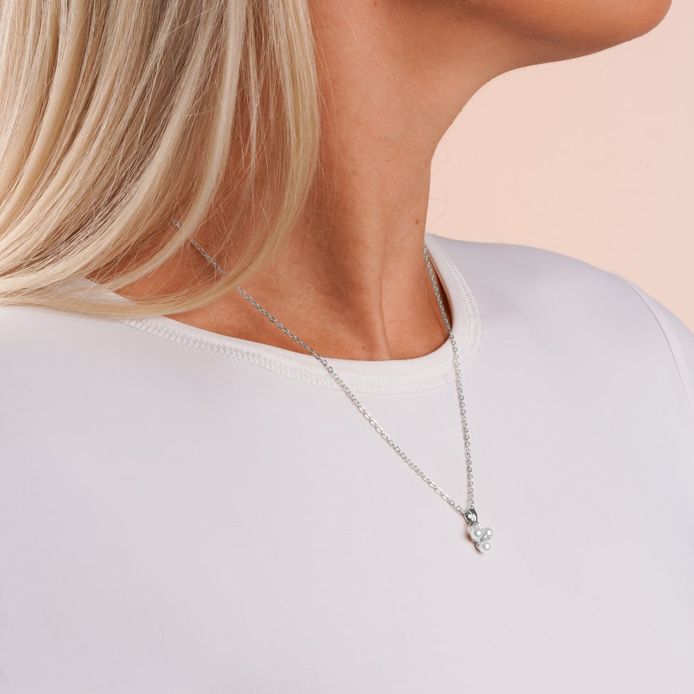 Eira Tripple Pearl er et delikat smykke med anheng dekorert med tre syntetiske perler og en glitrende kubisk zirkonia i midten. Designet kombinerer enkel eleganse med feminin sjarm, og passer like godt til hverdagsbruk som til festlige anledninger. Kjedet er laget av nikkeltestet messing, og belagt med sterling sølv. Lengden på 45 cm gjør det perfekt som et klassisk halskjede som hviler pent på brystet.