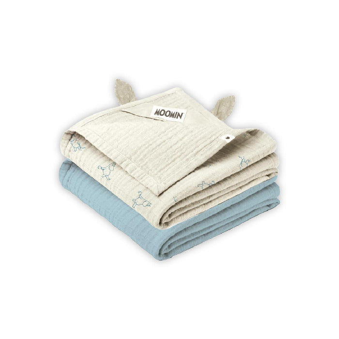 Mummi babykluten i blått kombinerer praktisk funksjonalitet og sjarm, med et mykt, pustende materiale utsmykket med herlige Mummi-tema-trykk. Designet med søte små ører i hjørnet, fungerer den også som en beroligende følgesvenn for babyer å holde eller tygge på under tannfrembrudd.