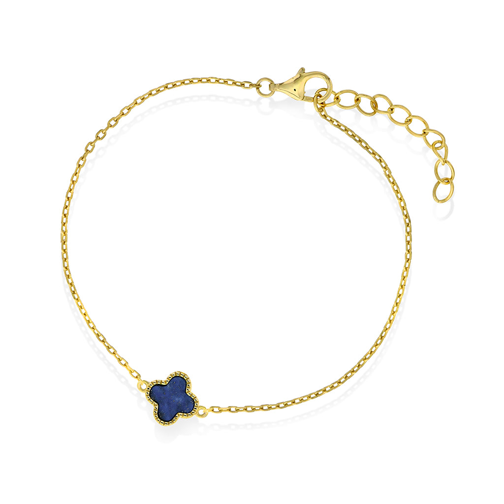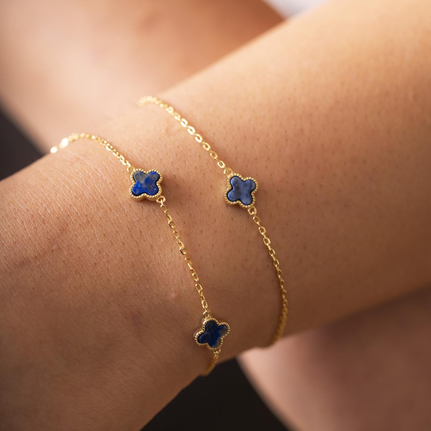 Lekkert armbånd i forgylt sølv med havblå kløver. Kommer med tilhørende smykke og øredobber, samt i flere farger.