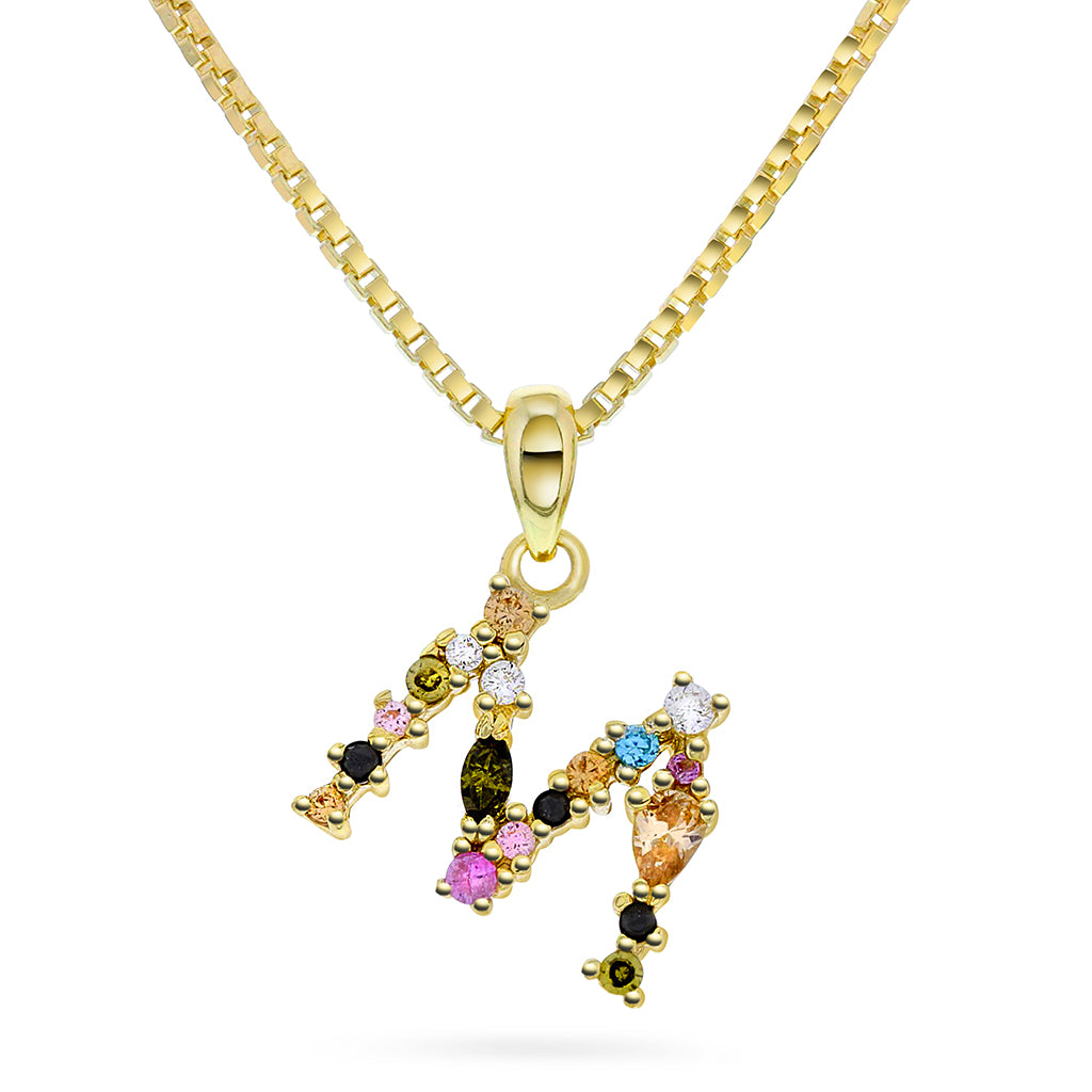 Bokstavsmykke i forgylt sølv med flerfarget zirkonia. En personlig og fin gave. Veneziansk kjede i forgylt sølv på 45cm medfølger, samt gaveeske.
