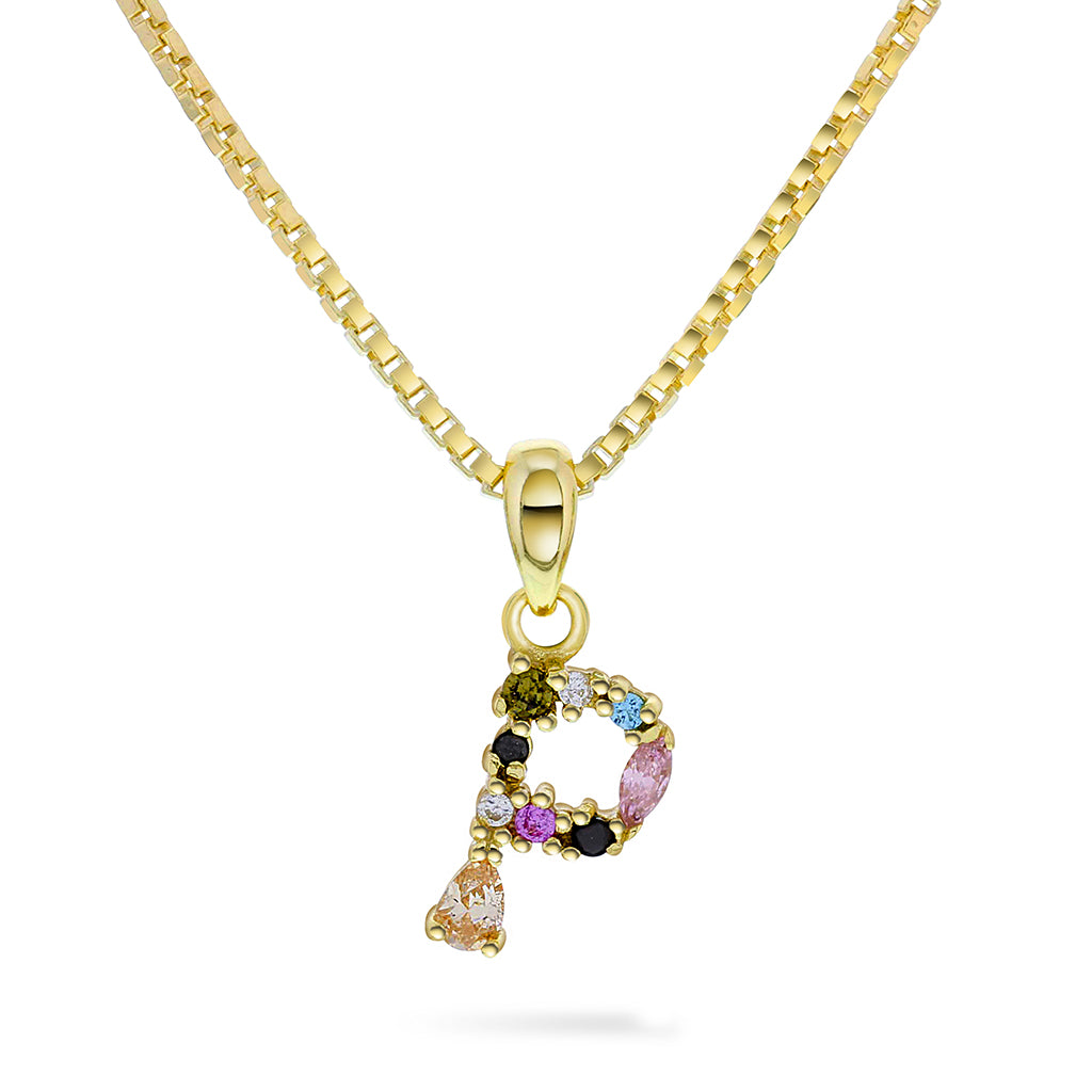 Bokstavsmykke i forgylt sølv med flerfarget zirkonia. En personlig og fin gave. Veneziansk kjede i forgylt sølv på 45cm medfølger, samt gaveeske.
