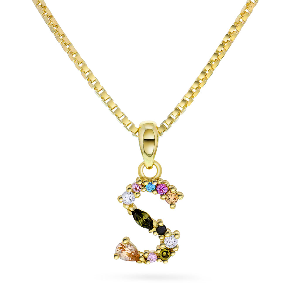 Bokstavsmykke i forgylt sølv med flerfarget zirkonia. En personlig og fin gave. Veneziansk kjede i forgylt sølv på 45cm medfølger, samt gaveeske.