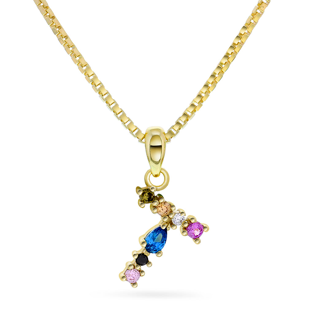 Bokstavsmykke i forgylt sølv med flerfarget zirkonia. En personlig og fin gave. Veneziansk kjede i forgylt sølv på 45cm medfølger, samt gaveeske.