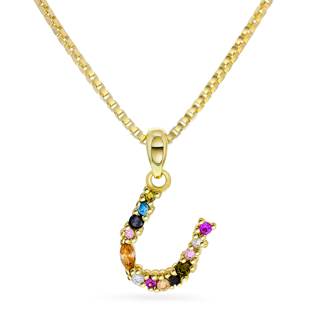 Bokstavsmykke i forgylt sølv med flerfarget zirkonia. En personlig og fin gave. Veneziansk kjede i forgylt sølv på 45cm medfølger, samt gaveeske.