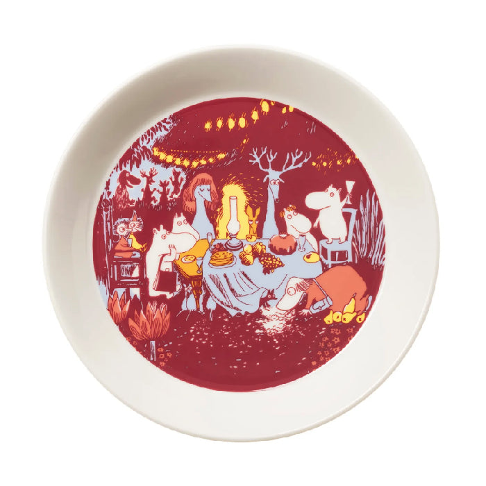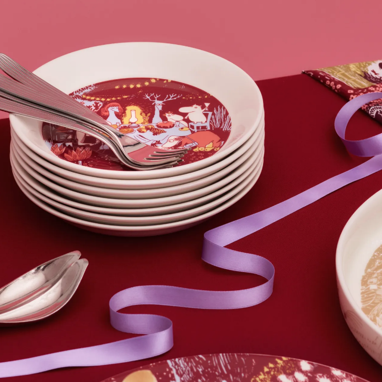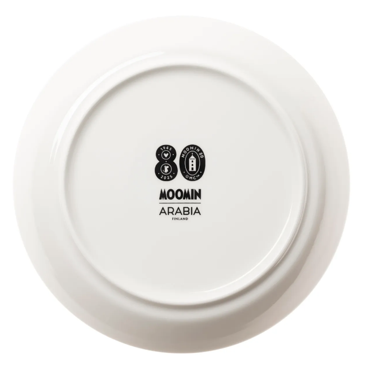Moomin 80-kolleksjonen Festlige stunder feirer samhold og vennskap. La oss feire gleden ved å være sammen og vise takknemlighet til venner, hvor enn de måtte være! Tallerken har et spesielt Moomin 80-bunnstempel.
