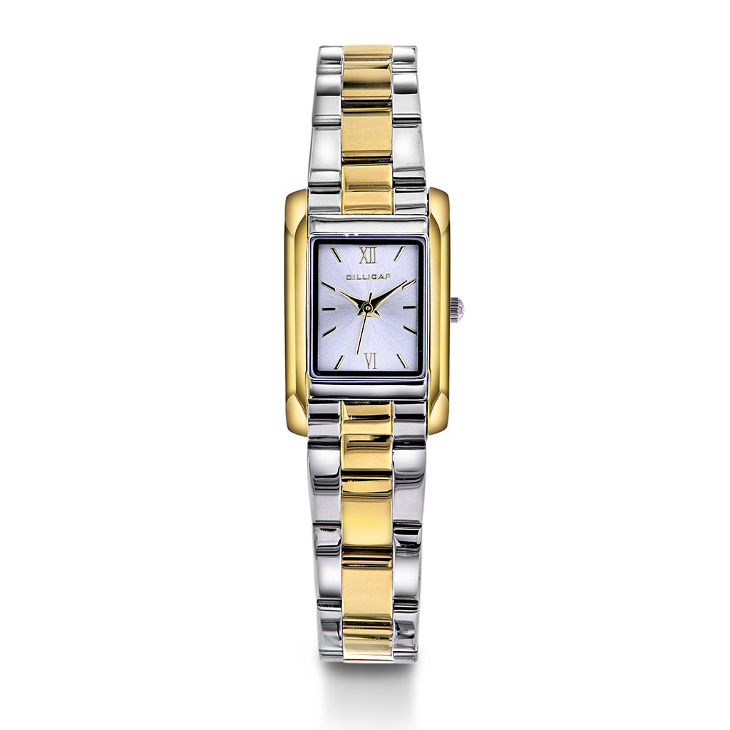 Sølv og gullfarget kasse med sølv skive og gullfarget index.