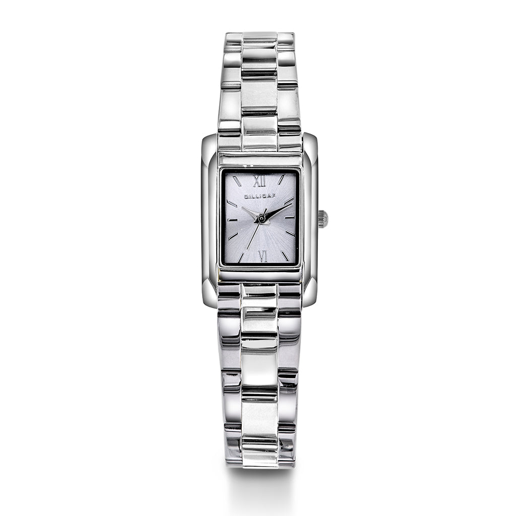 Sølvfarget kasse med sølv skive og sølvfarget index.