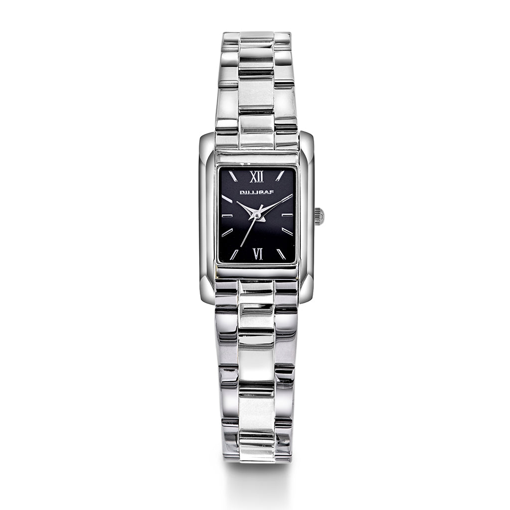 Sølvfarget kasse med sort skive og sølvfarget index.