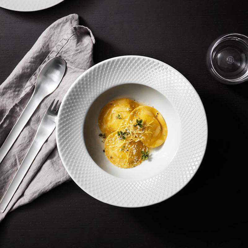 Lyngby Porcelæn Rhombe dyp tallerken 24,5 cm hvit er en delikat og anvendelig tallerken som setter stemningen for måltidet. Med sin åpne form og generøse størrelse er den perfekt for pastaretter, supper eller salater – og den elegante relieffdekorasjonen gir et eksklusivt løft.