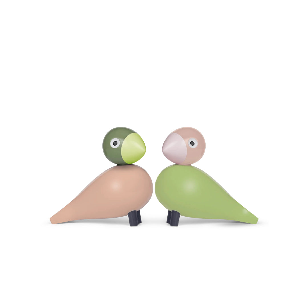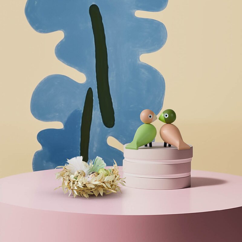 Turtelduer i lys grønn og rosa fra Kay Bojesen er en hyllest til kjærlighetens magi og dansk designtradisjon. Laget av FSC-sertifisert bøketre og malt med presisjon, utstråler disse fuglene en balanse mellom moderne fargetrender og klassisk estetikk.