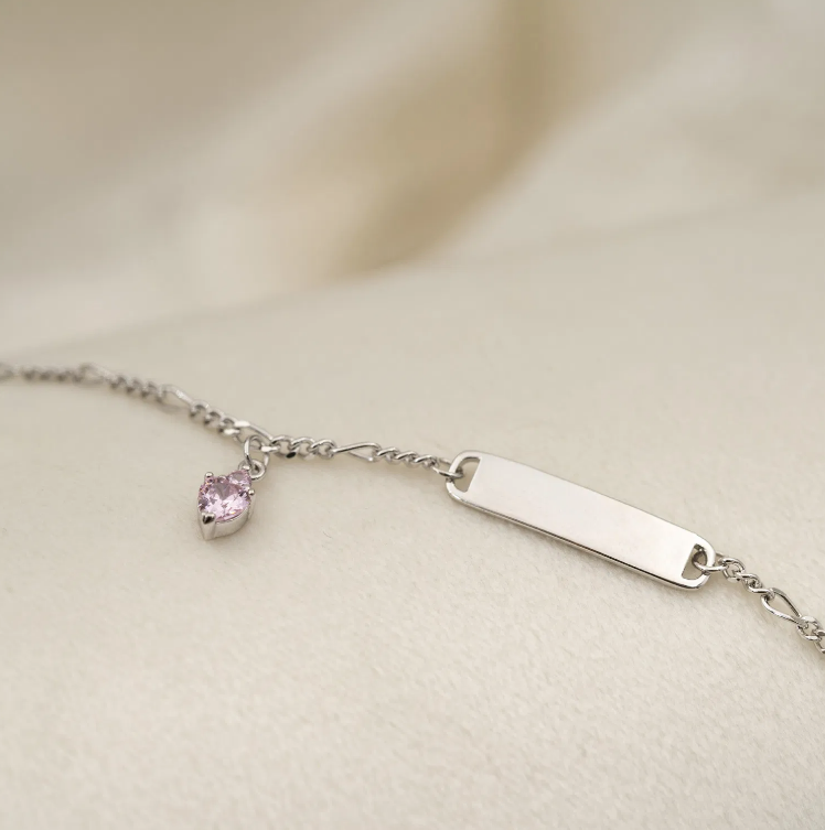 Vakkert armbånd med graveringsplate og rosa zirkonia.