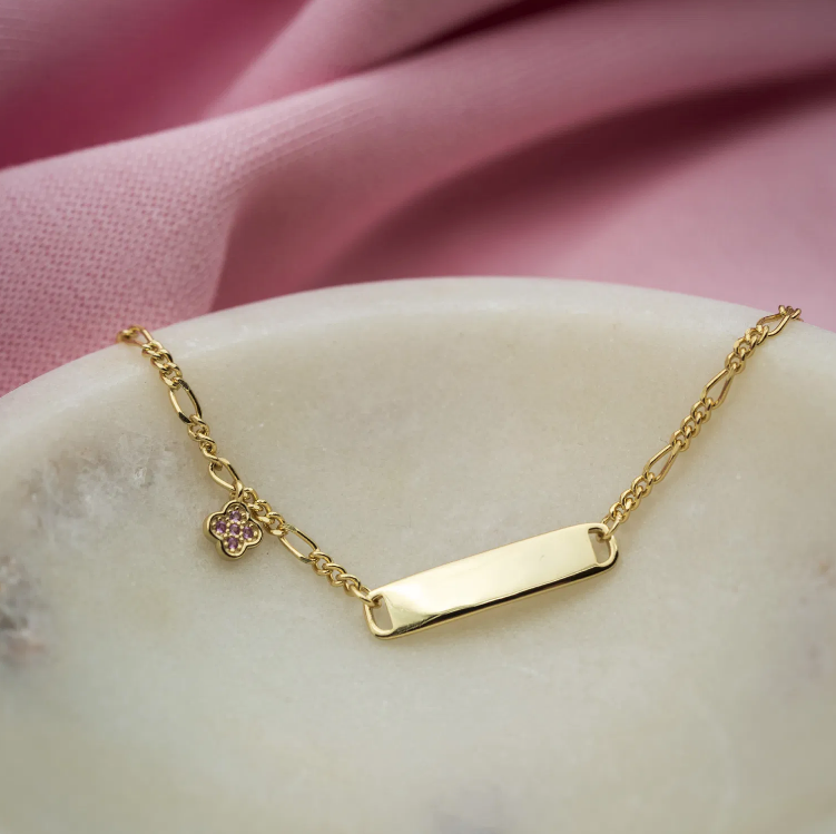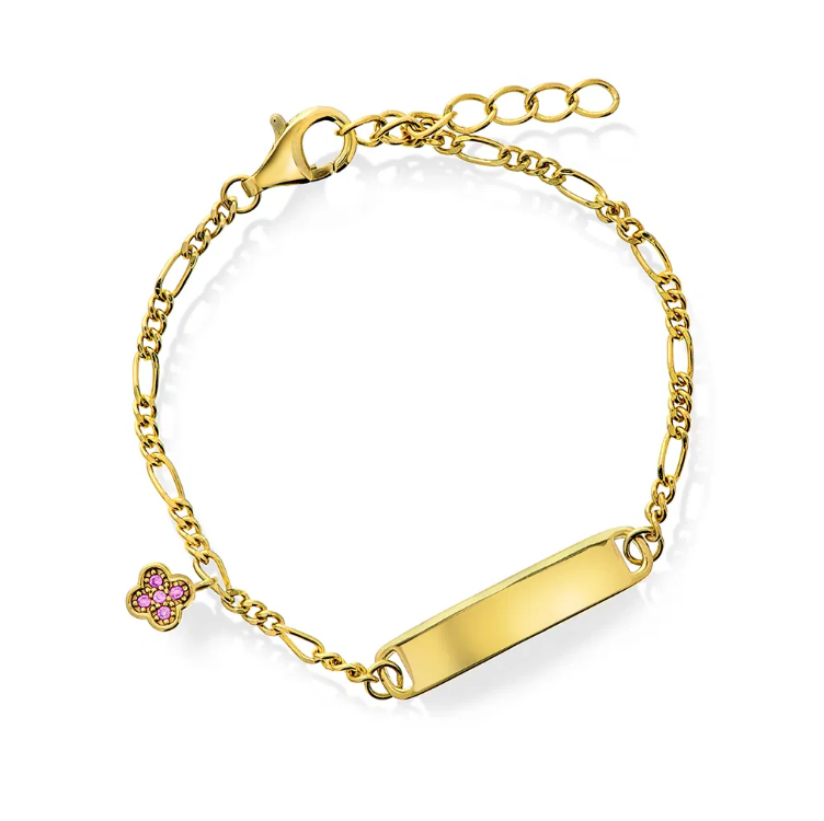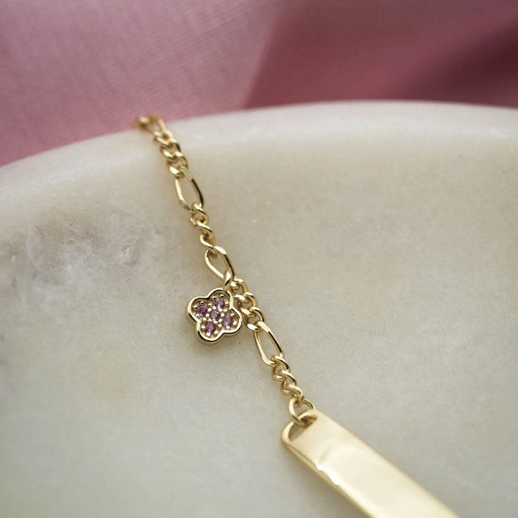 Vakkert armbånd med graveringsplate og kløver dekoret med rosa zirkonia.