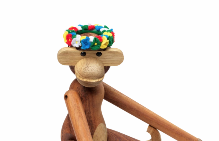 Fin midtsommerkrans fra Kay Bojesen i grønnmalt bøk med søte stoffblomster i forskjellige farger. Blomsterkransen er skapt for å kunne plasseres på hodet til tredyrene. På den måten får du enkelt den rette stemningen av vår og sommer.